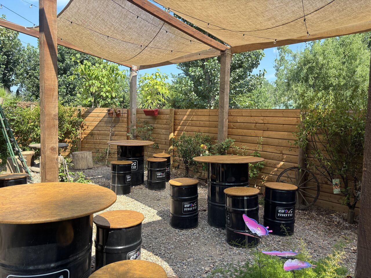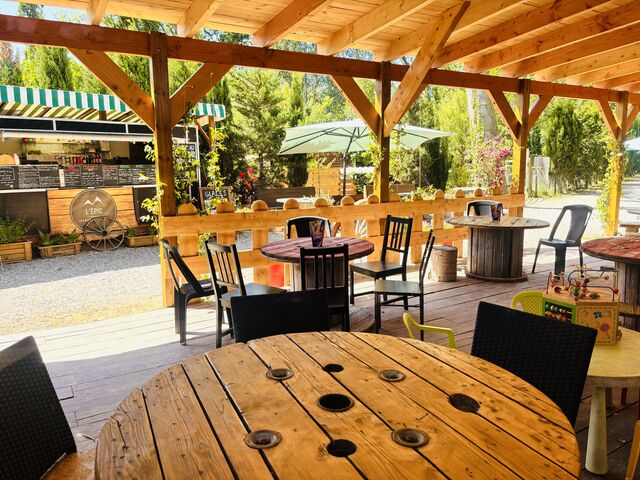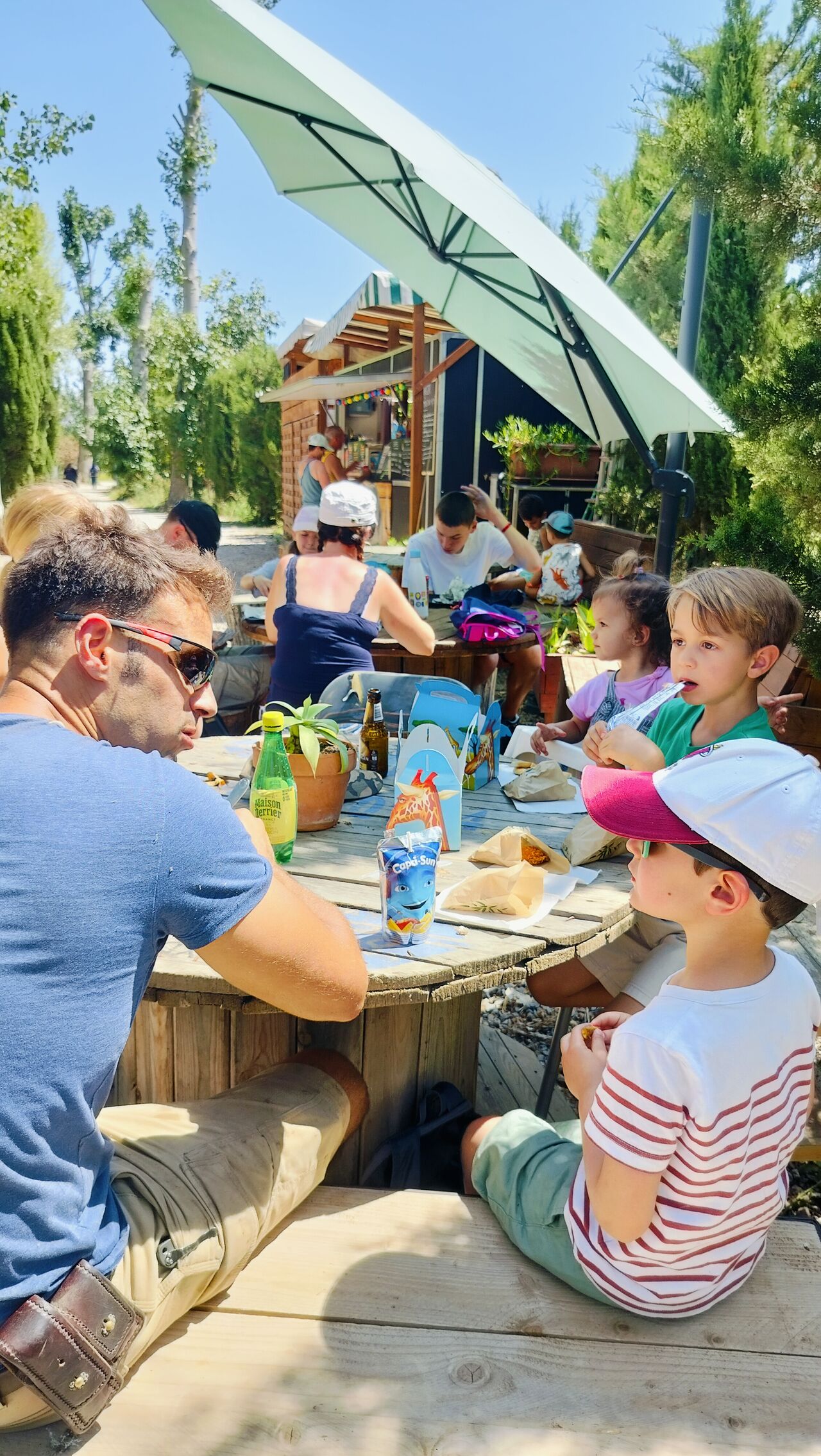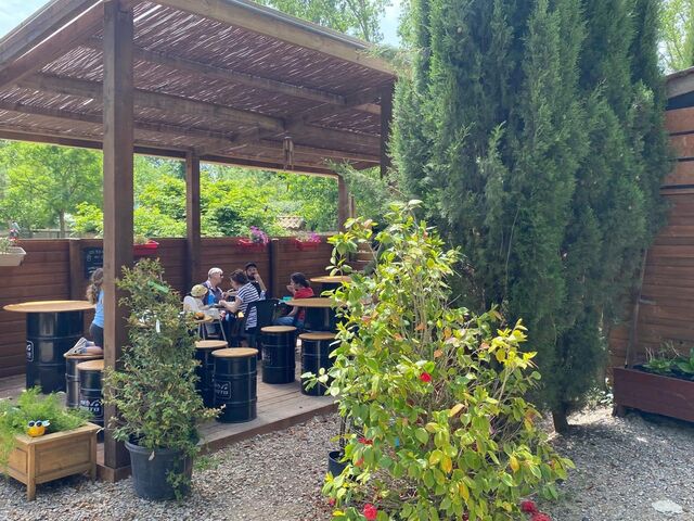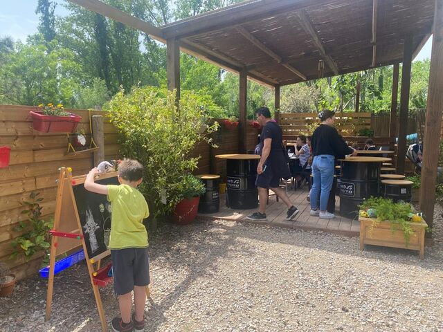 Terrasse ombragée et pensée pour les enfants (jeux, tables enfants, chaises hautes), venez profiter de notre terrasse lors de votre visite dans le parc ou arrêtez vous prendre un bol d’air frais, de nature et de calme le temps d’une pause repas si vous venez de l’extérieur.